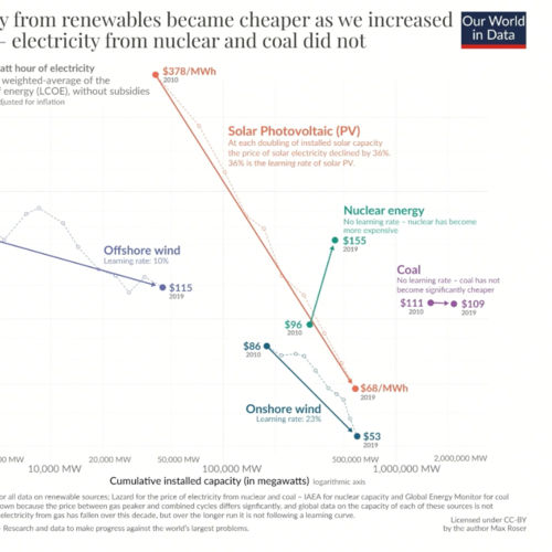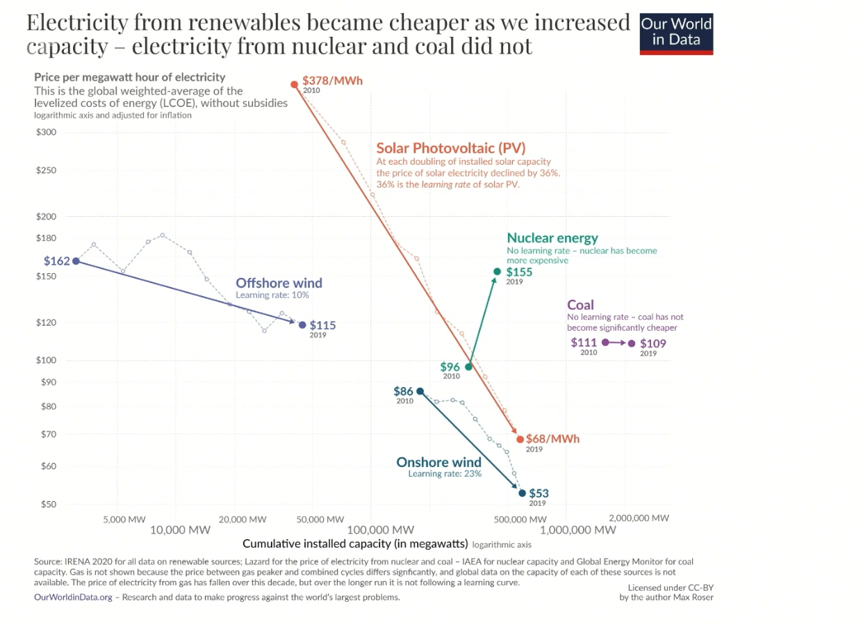 Ich: Ja – wir müssen endlich aufhören schädliche, veraltete Technologie zu subventionieren und in zukunftsfähige investieren. Und global sind wir ja schon am Weg, wie die Grafiken zeigen. Die alternativen Energiegewinnungsformen haben auch ökonomisch die alten Technologien schon längst überholt. Wir sollten aufhören uns ideologisch an diesen weiterhin festzuhalten.